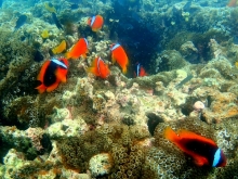 辺野古でもう一つ特徴的なダイビングポイントは「クマノミ城」といって水深5mほどに直径2mほどの根に何百というクマノミのみが群生しているのだ。河口の近くにあるため透明度が悪い時があるのが玉にきずだ